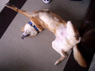 ニックは撫でてもらうのが大好き。 いつでも撫でて欲しい様子。 「撫でて欲しいな~♪お願いね♪」 そのお願いを無視してしばらくすると… こういう格好になります。 右前足を上にぴーんっと伸ばします。 前に、テレビで同じ格好をしている犬を見たけど、 この格好をするわんこを飼っている方、います? ↑このニックさんはまだ可愛い感じだけど、 …なんか、ちょっと怖いのだけど、その格好。 何故、前足ピンッなの?