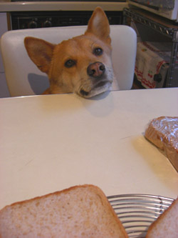 「いいよね、人間は。好きなときに好きな物食べられるしさ。 犬は目の前にパンがあっても取れないし、どうせ貰えないし。」 「…あっ!あそこに蝶が飛んでるよ…てふてふが…」 欲しいMAX状態が突き抜けてしまって うつろな目になってしまった感じのニックさん。 放心状態か?